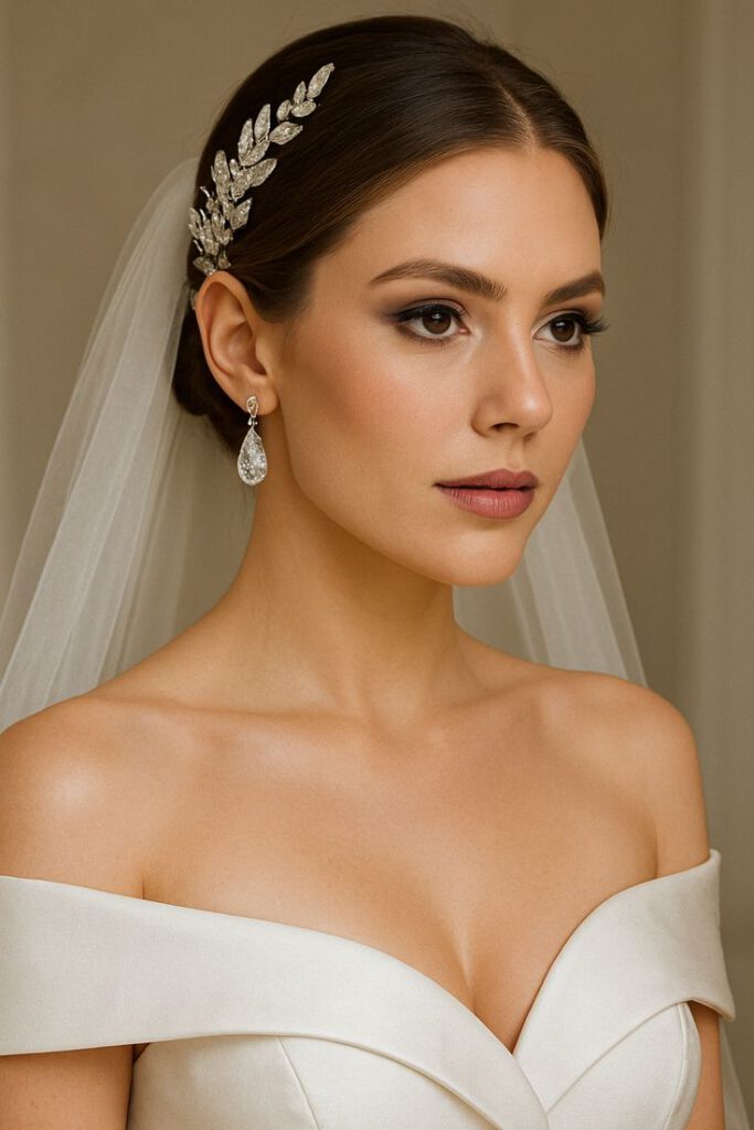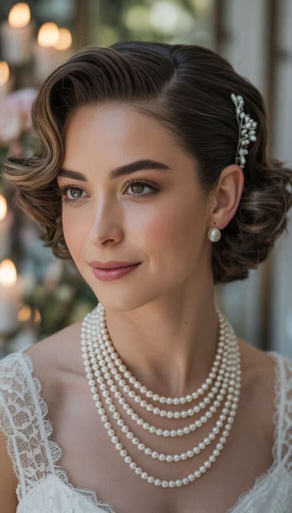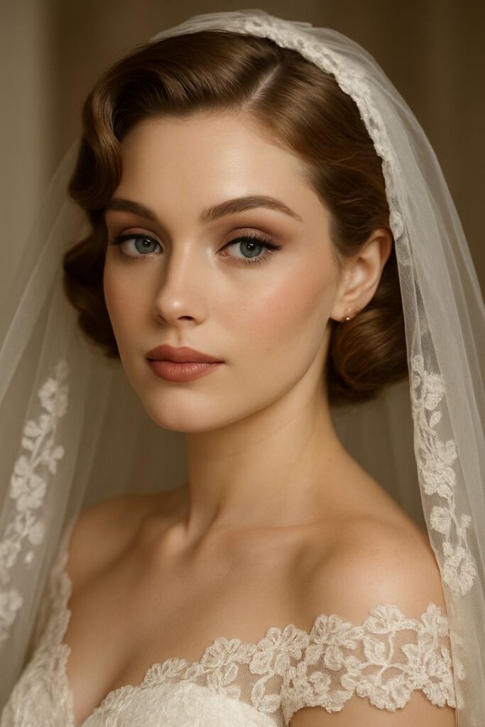 Vintage stili, dalgalı bob kesimler, retro topuzlar, düşük örgü ve saç aksesuarlarıyla tamamlanır. Gelinliklerde ise dantel detaylar, uzun kollu elbiseler, A-line ve balık kesim modeller öne çıkar. Bu stilde genellikle klasik duvak veya incili saç tokaları tercih edilir; bu da gelinin nostaljik ve zarif havasını tamamlar.